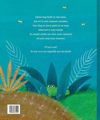 Kleine Aap heeft zo iets leuks, dat wil ze aan iedereen vertellen. Voor dag en dauw gaat ze op stap, helemaal in haar eentje. En steeds verder van huis, want niemand wil echt naar haar luisteren. Of toch wel? En wat is er nou eigenlijk aan de hand? * PRENTENBOEK VAN HET JAAR 2026 *