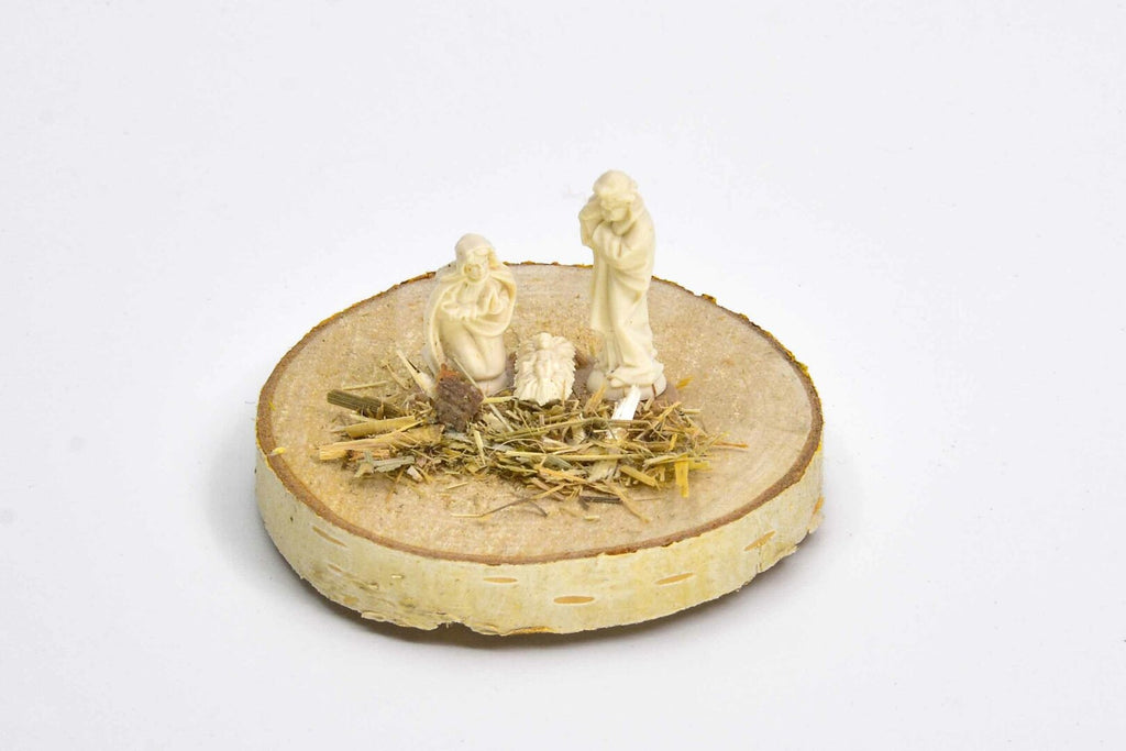 Kerstfiguur op houten boomschijf Maria Jozef Jezus Tekst: Gods zegen. Materiaal: resin op hout 3cm disc 4-5cm -0,5cm h