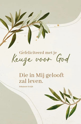 Wenskaart Gefeliciteerd met je keuze voor GodBijbeltekst voorzijde:Die in Mij gelooft zal leven.Johannes 11:25 bFormaat: 115 x 175 mm