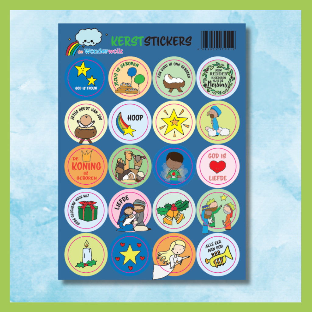 Stickervel van 13x18cm met 20 ronde stickers met Bijbelse boodschap rondom Kerst. Leuk om cadeau te geven, te gebruiken als beloningstickers of om je boek mee te versieren.