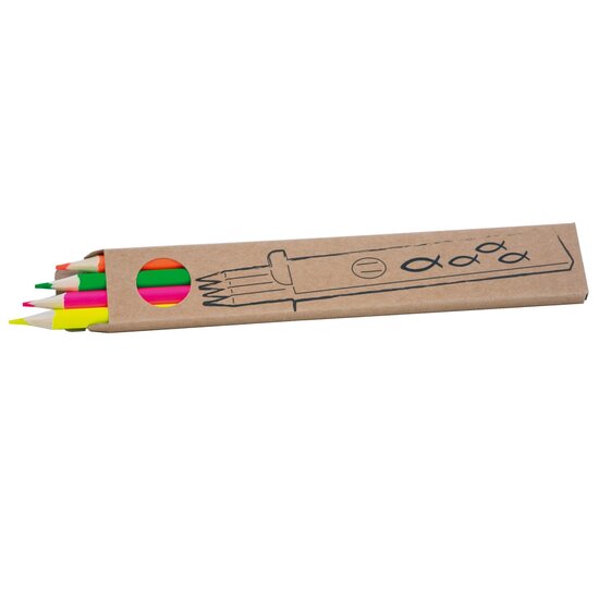 De set van 4 kleurpotloden bestaat uit 4 neonkleuren elk 1x in de kleuren roze, geel, groen en oranje.