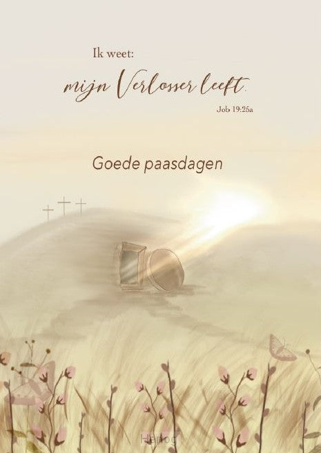 Enkele wenskaart met envelopOpdruk: Goede paasdagenBijbeltekst (HSV): Ik weet: mijn Verlosser leeft - Job 19:25aFormaat: 105 x 148 mm.