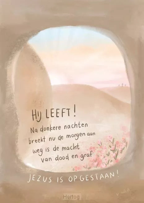 Enkele kaart met envelopFormaat: 105 x 148 mm.Opdruk:Hij Leeft!Na donkere nachtenbreekt nu de morgen aanweg is de machtvan dood en grafJezus is opgestaan!© Made by Alett