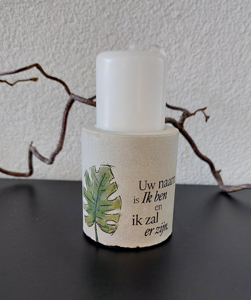 Multifunctionele kaarsenhouder voor zowel een mini stompkaars, waxinelichtje als voor een dinerkaars. Deze mooie rustieke kaarsenstandaard is voorzien van een prachtige tekst! Mede mogelijk gemaakt door mensen met een afstand tot de arbeidsmarkt. Deze kaarsenstandaard wordt geleverd incl. mini stompkaars.